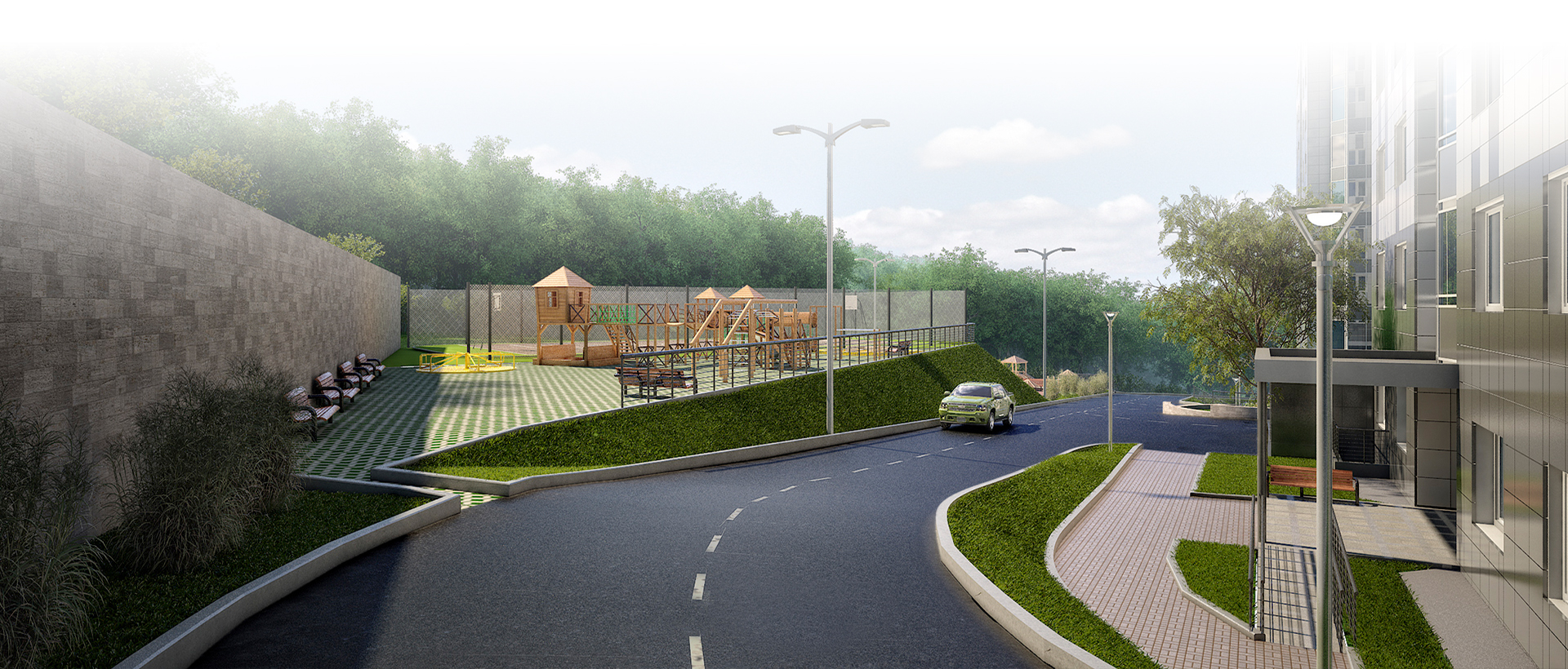 Жилой комплекс удачно вписывается в окружающий зеленый ландшафт, органично дополняя его. Выйдя из дома, можно насладиться красотой окружающей природы, вдохнуть чистый воздух, погрузиться в атмосферу загородной жизни.